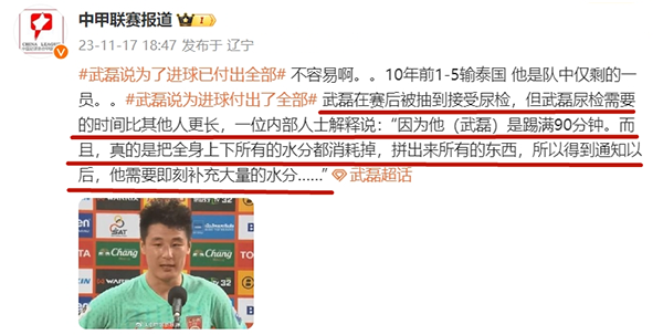 男足球员的体能消耗有多大呢?赛后,本场比赛表现出色的武磊被抽到了接受尿检,而根据中甲联赛报道的爆料,在接受尿检的时候,武磊也是出现了意外的情况。根据爆料,此次尿检,武磊尿检的时间比其他人更长,因为武磊是踢满了90分钟,他已经把全身上下的水分都已经消耗掉,拼出来所有的东西,所以得到通知之后,武磊也是需要补充大量的水分,这也让武磊尿检需要的时间更长。