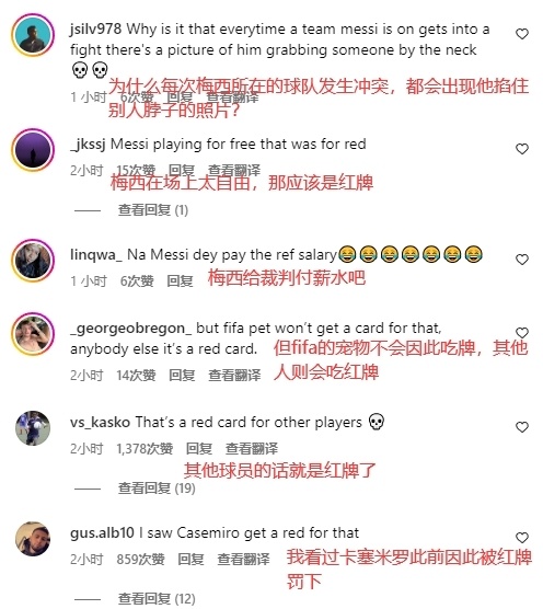 还有球迷质疑梅西就是有特权:“换做是其他人恐怕要被罚下几次了!”;“FIFA的宠儿不会因此吃牌,其他人则会吃到红牌!”:“梅西快点给主裁支付薪水吧!”:“如果是C罗,恐怕不会是这样的判罚!他会被外界炮轰要废人”;“梅西在场上太自由了,主裁对他太放纵,那确实应该是红牌动作!”