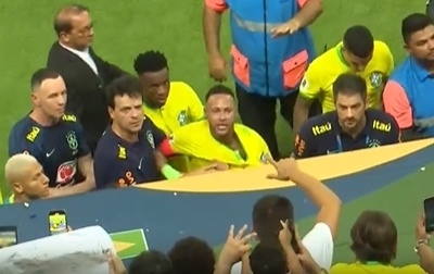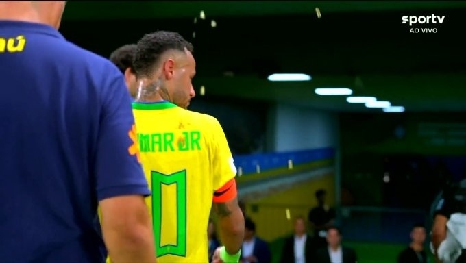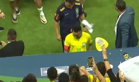 当时,作为球队队长的内马尔带领队友们退场。而内马尔走在队伍的最前面,因为主场丢分,内马尔情绪不佳,低头没有与看台上的主场球迷致意,这本就让窝火的巴西球迷更加气愤。有球迷直接从看台丢下没有吃完的爆米花,还有其他异物,这些东西不偏不倚正好砸中了走在队伍最前面的内马尔头上。
