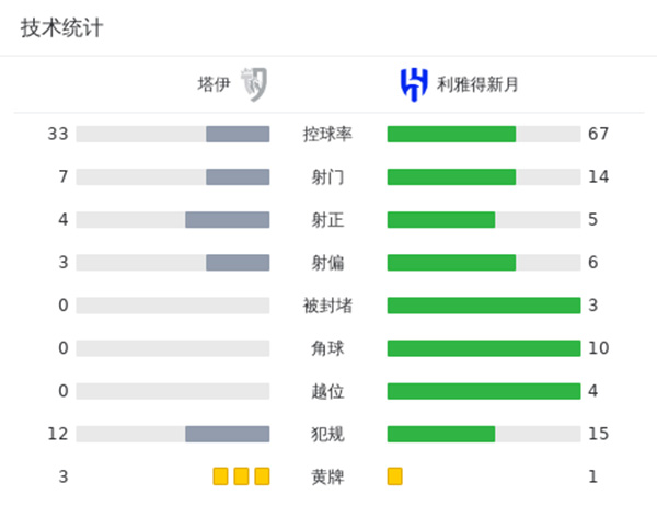 关键事件: 第19分钟,新月右路传中,多萨里中路跟进凌空端射破门,利雅得新月1-0塔伊。
