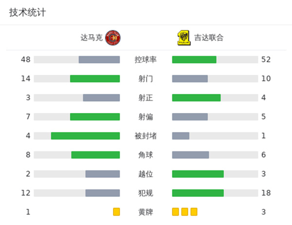 上半场补时第7分钟,吉达联合后卫解围失误,恩库杜禁区左侧停球抽射再次得分,达马克2-1吉达联合。