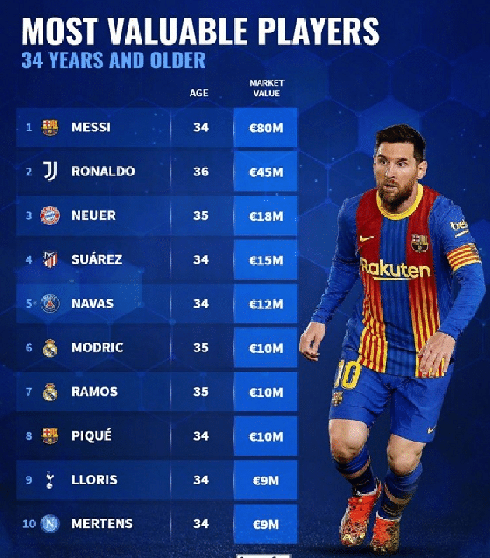 360直播讯在足坛,许多球员在30岁之后,身价都有急速下滑,特别是超过了34岁之后,即便你再优秀,身价也不过在一两千万左右,不过也有部分球员是例外的,比如足坛最好的球星梅西和C罗,即便他们超过了34岁,他们的身价依然居高不下,那么他们的身价到底有多高呢?近日,德国权威媒体《转会市场》盘点了足坛34岁以上球员的身价排名,其中梅西在第一档,而C罗在第二档,其他人共享第三档。