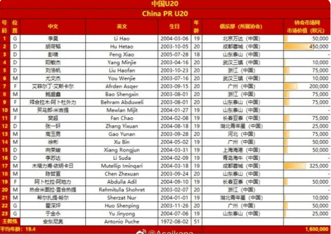 权威转会网站“德转”中国站管理员朱艺确认,国青本届亚洲杯的23人大名单诞生,由新晋的马竞小将李昊和恒大小将艾菲尔丁,以及成都新锐胡荷韬三大新核领衔。其中胡荷韬是队内头牌,“德转”身价达到45万欧元,为全队最高,队内头号射手艾菲尔丁则只有20万欧元,近期官宣加盟马竞的门将李昊暂时只有5万欧元的身价。