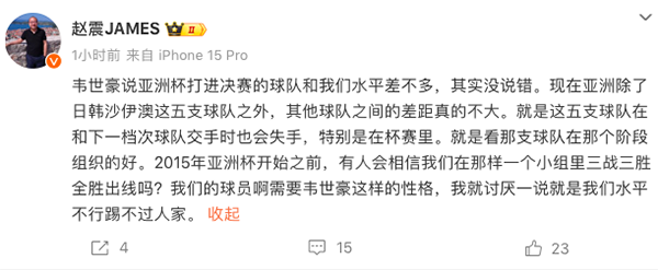 360直播3月1日讯,知名媒体人赵震在社交账号上更新动态,发文声援当红国脚韦世豪此前接受采访时的争议言论。赵震直言,除了日韩沙伊澳这5队,亚洲其他球队实力确实差不多。