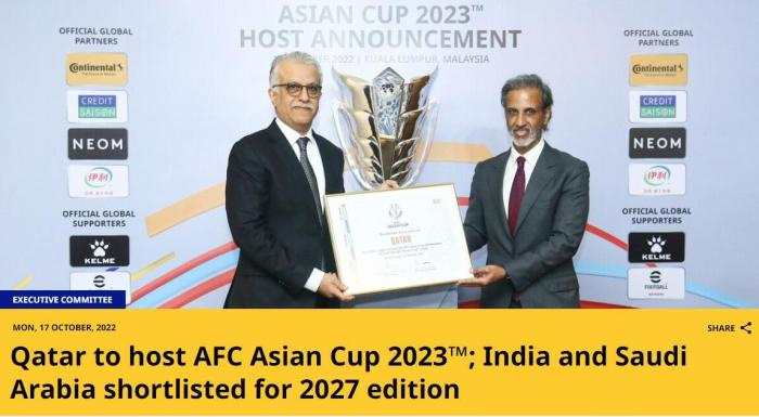2023年亚洲杯原定于明年在中国举办,但今年5月亚足联宣布易地,最终卡塔尔获得主办权,他们是上届赛事冠军。