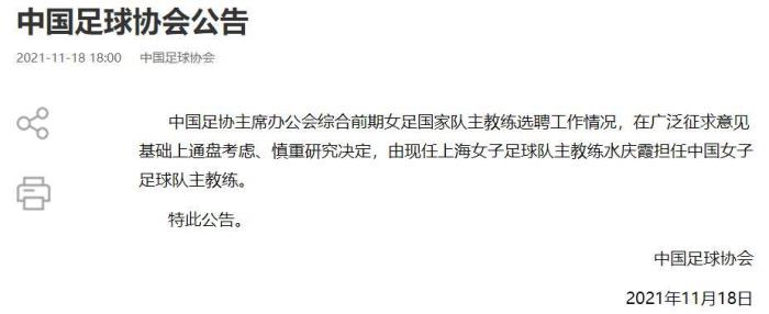 中国足协主席办公会综合前期女足国家队主教练选聘工作情况,在广泛征求意见基础上通盘考虑、慎重研究决定,由现任上海女子足球队主教练水庆霞担任中国女子足球队主教练。